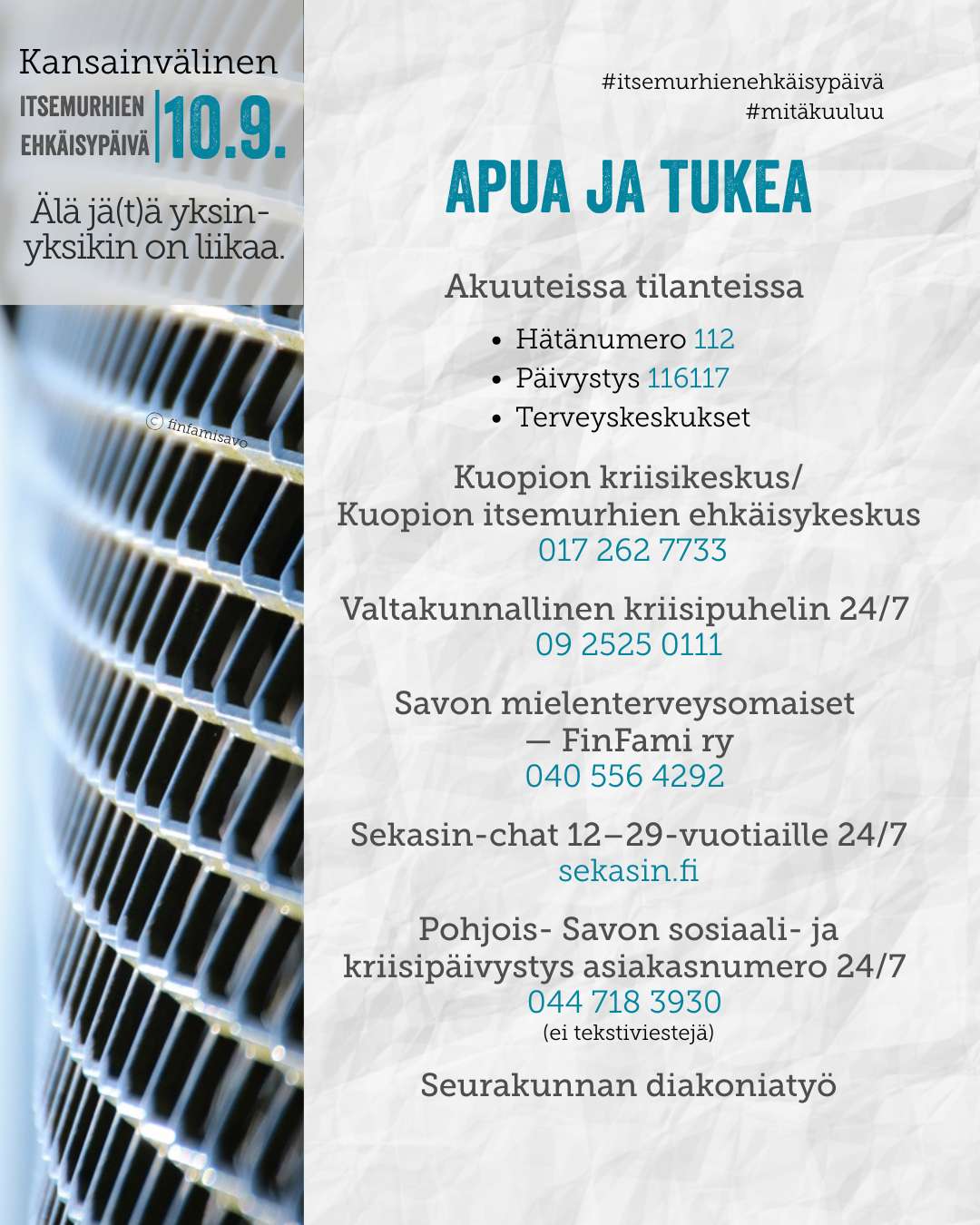 • Pohjois- Savon sosiaali- ja kriisipäivystys asiakasnumero 24/7