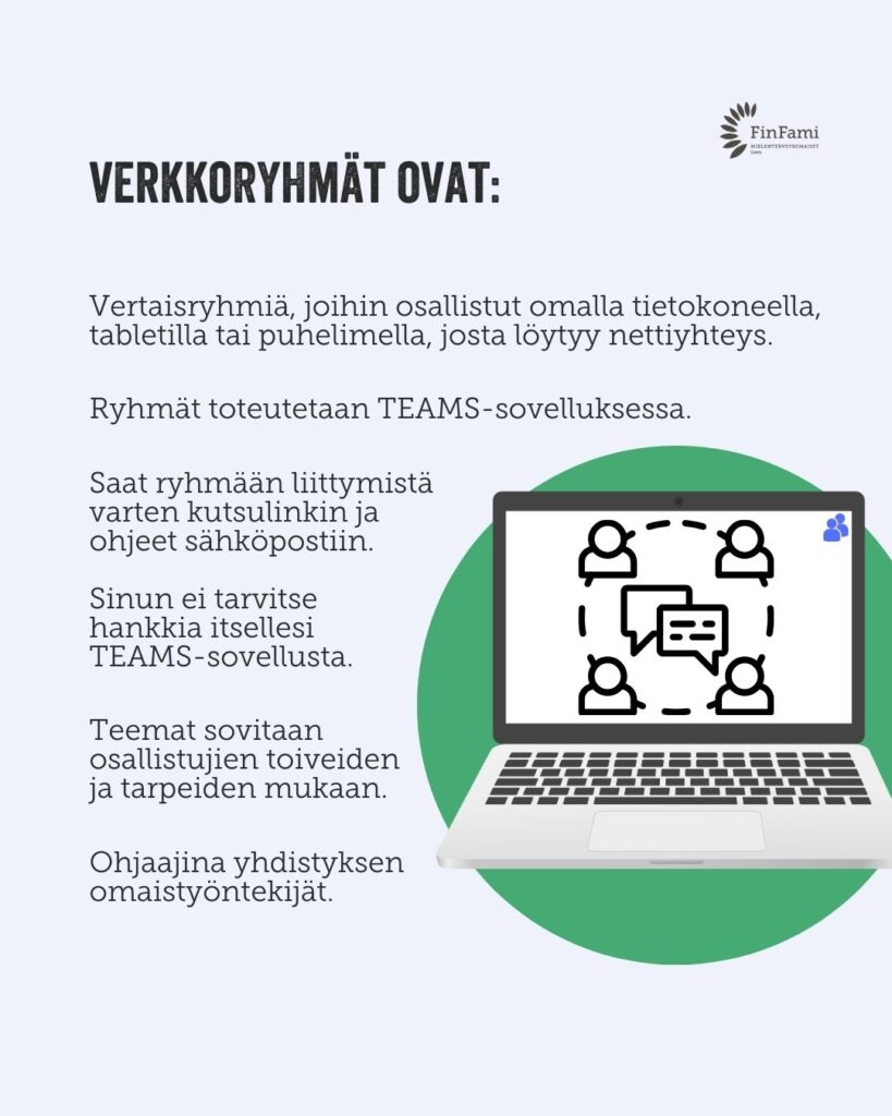 FinFami-yhdistykset järjestävät erilaisia etänä tai verkossa toteutettavia vertaistukiryhmiä ja muuta verkkovälitteistä toimintaa. Tälle sivulle kootaan kaikki verkossa toteutettavat toiminnot, joihin voi osallistua paikkakunnasta riippumatta. Katso lisätiedot ryhmistä kunkin ryhmän omalta lisätietosivulta ja ilmoittaudu mukaan!